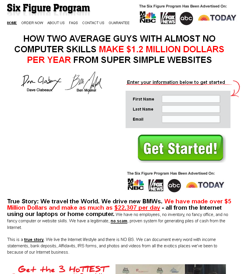 If you click on the prominent "Clicking Here" link, you get redirected through referer.us/moxiinternal.go2cloud.org/aff_c?offer_id=2&aff_id=1002&aff_sub=020 to a site called sixfigurekit.com run by an outfit called the "Six Figure Program". The BBB rates the Six Figure Programs as an F in Florida, an F in Illinois but bizarrely a B in New York. On balance it looks pretty poor.